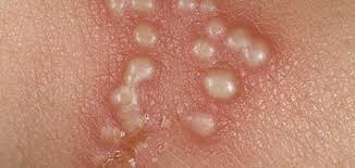 (4) الشعور بوخز أو حرقان أو حكة فى الأعضاء التناسلية لكلا الجنسين ، يلى ذلك بوقت قليل ظهور تجمعات حويصلية متقرحة على القضيب أو الحشفة أو الشفرين مصحوبة بآلام شديدة ، و قد تصيب هذه التقرحات مجرى البول مسببة حرقان أثناء التبول